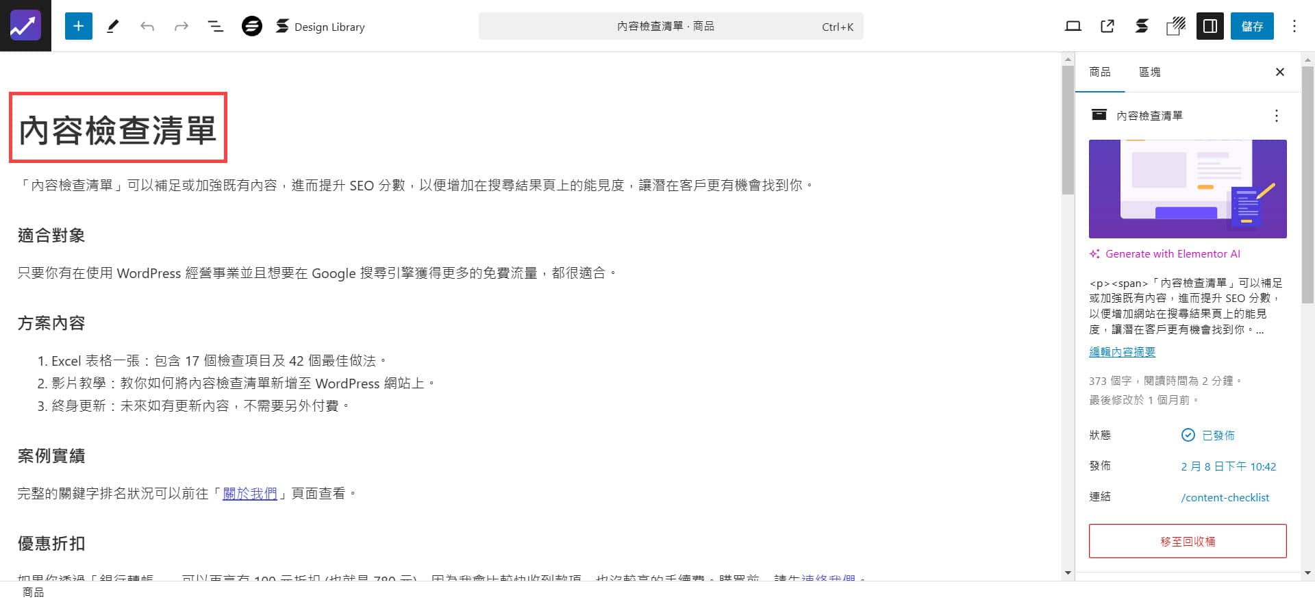 如果你想讓網站的內容更具競爭力,除了透過 SEO 外掛輔助外,也建議搭配我們所製作的內容檢查清單,內含 17 個檢查項目及 42 個最佳做法。此外,還會教你如何將檢查清單新增至 WordPress 網站上。